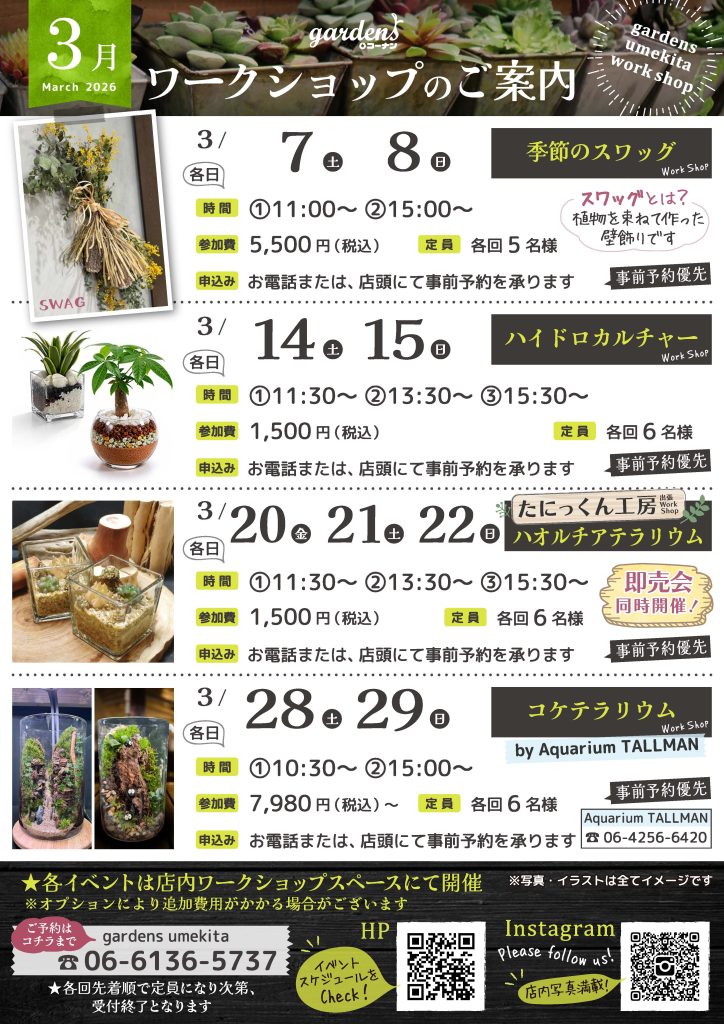 2026 0302 2026年3月gardens umekita Event&Work Shopのご案内 開催日時、ご予約方法は各イベントページよりご確認いただけます。定員が設けられているイベントは定員に達し次第受付を終了いたします。予めご了承くださいませ。 3/28(土)29(日)コケテラリウムWorkShop byAquarium TALLMAN Post Share Hatena Pin it 2026年4月gardens umekita Event&Work Shopのご案内 次の記事