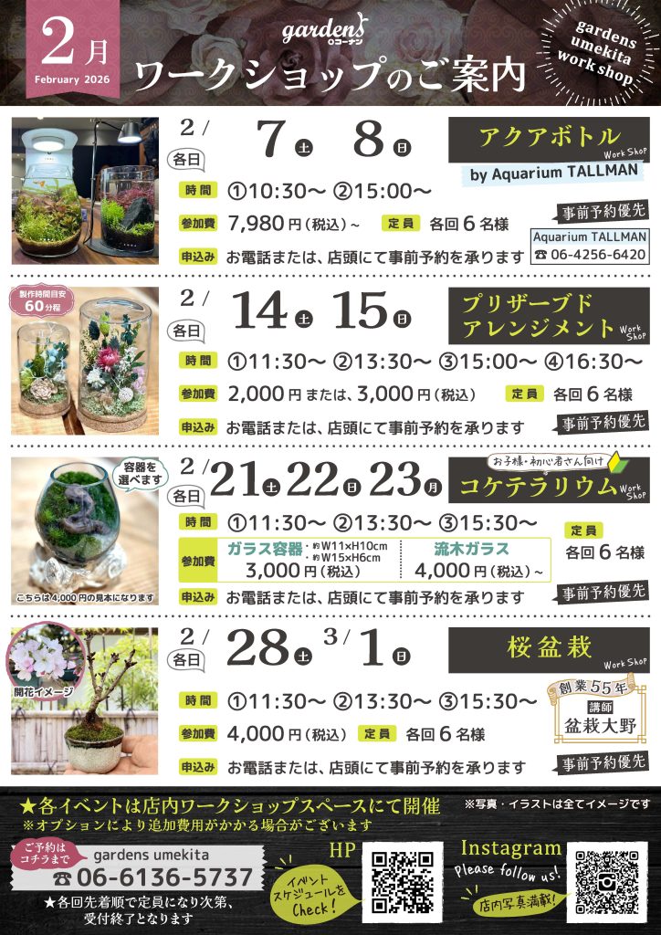 2026 0130 2026年2月gardens umekita Event&Work Shopのご案内 開催日時、ご予約方法は各イベントページよりご確認いただけます。定員が設けられているイベントは定員に達し次第受付を終了いたします。予めご了承くださいませ。 1/31(土)2/1(日)冬花の寄せ植えWorkShop 2/7(土)8(日)アクアボトルワークショップ by Aquarium TALLMAN 2/14(土)15(日)プリザーブドアレンジメントワークショップ 2/21(土)22(日)23(月)コケテラリウムワークショップ 2/28(土)3/1(日) 桜盆栽ワークショップ Post Share Hatena Pin it 2月17日(火)休館のお知らせ 前の記事